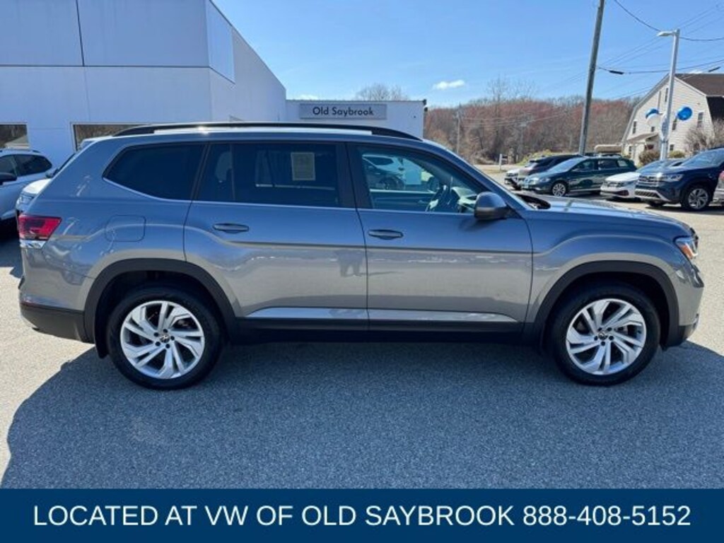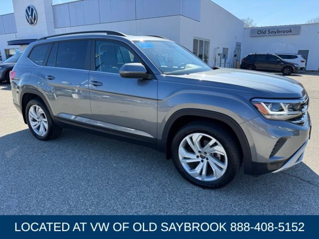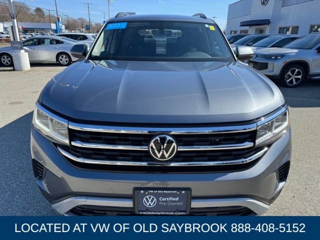 Located at Old Saybrook Volkswagen, VW CERTIFIED 6YR/74,000 MILE WARRANTY. CARFAX One-Owner. Clean CARFAX. Platinum Gray Metallic 2023 Volkswagen Atlas 3.6L V6 SE w/Technology AWD 8-Speed Automatic with Tiptronic 3.6L VR6